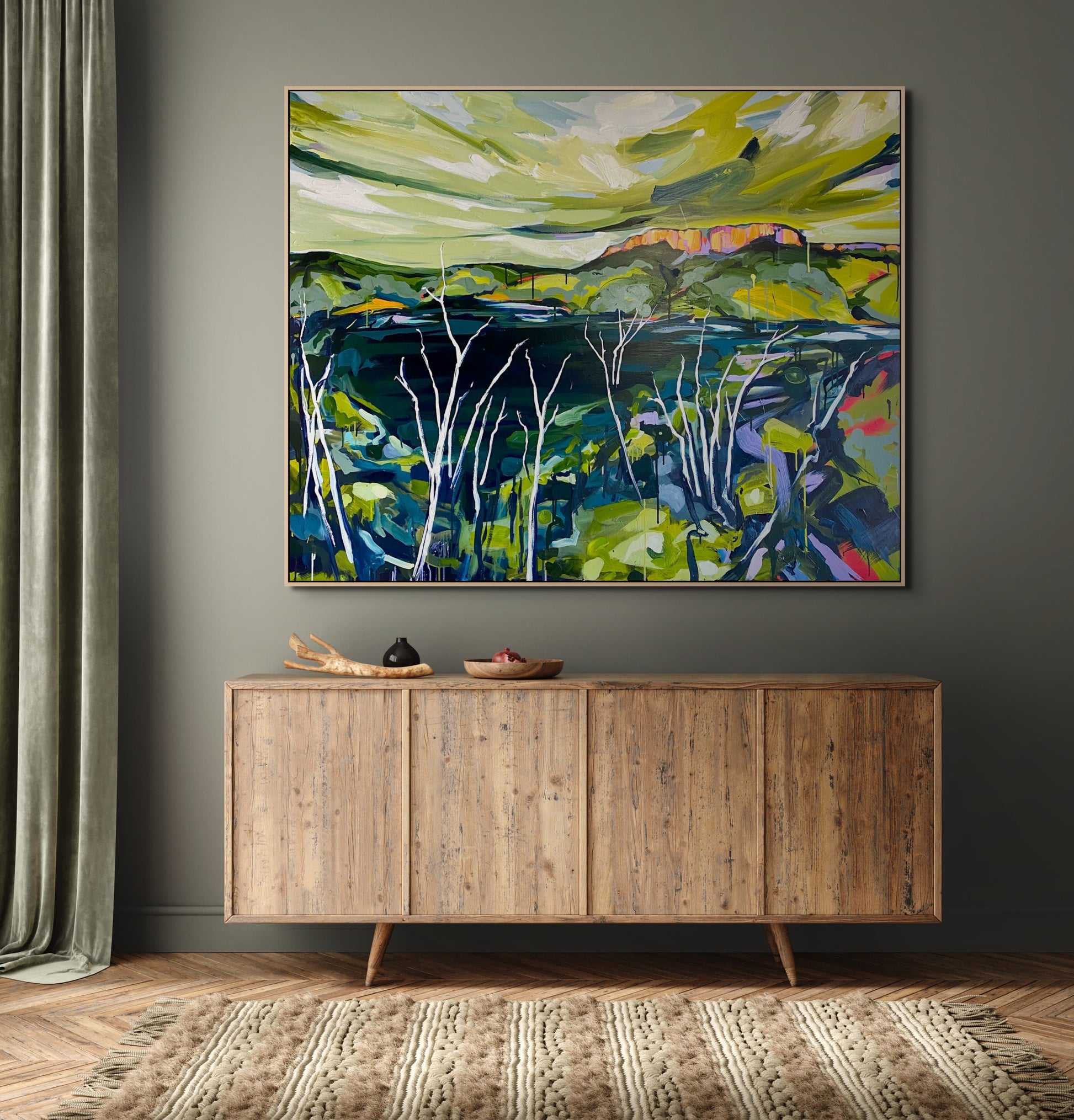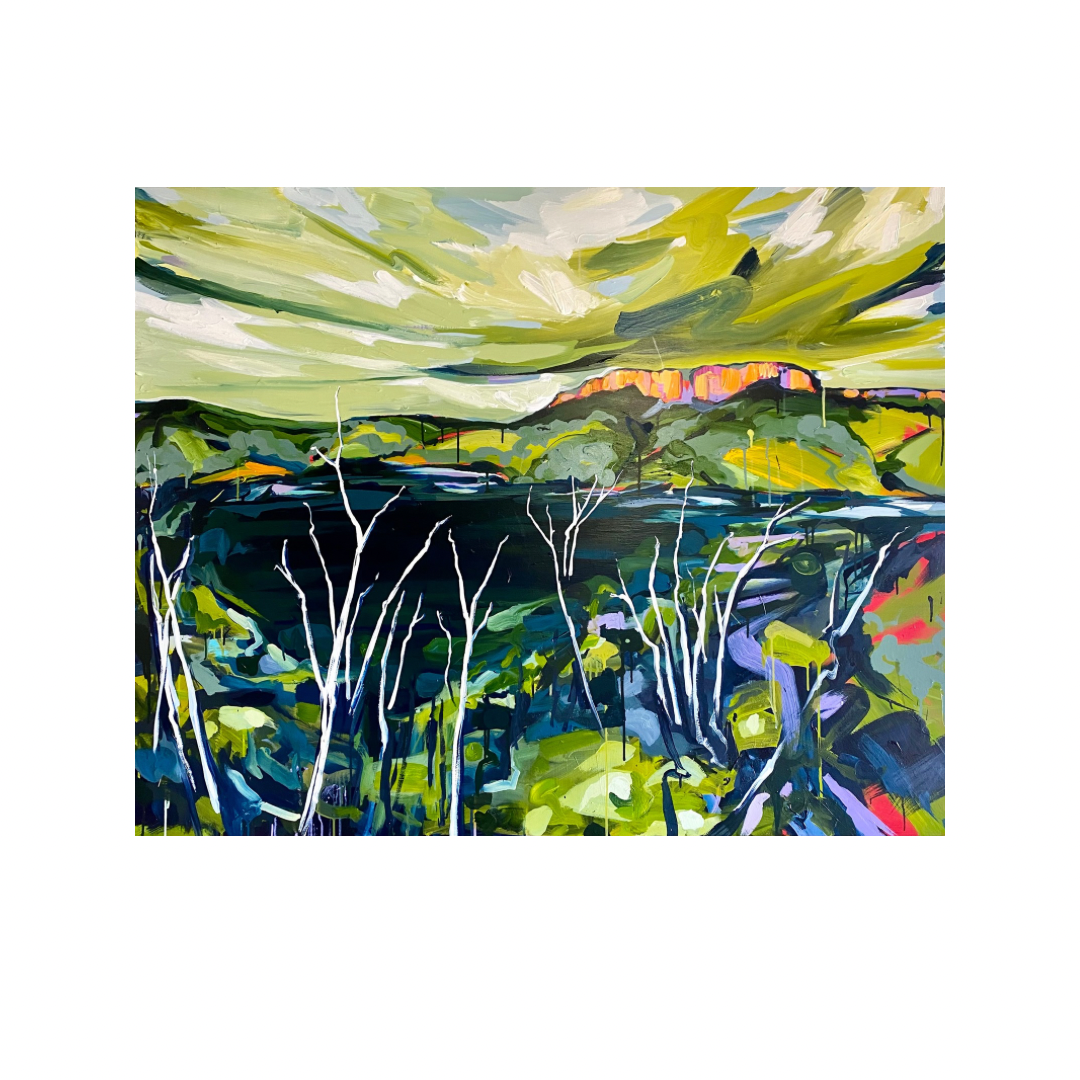 "Castle Mountain is the most iconic sandstone outcrop within the Cania Gorge National Park. This towering mountain, with its regal stature, commands the scene, its sheer walls seemingly adorned with the sky itself. Below the foothills of the mountain lies the man-made Cania Dam. Its’ dark, tranquil waters serve as a reflective canvas for the stark, ghostly white skeletons of dead timber that rise from its depths. These skeletal forms are a reminder of a past history – the abandoned gold mining town of Cania - buried deep below the surface of the dam. This artwork invites viewers to ponder the delicate balance between life and decay - history and human development. It is also a tribute to the enduring spirit of nature and the beauty that lies within its quiet waters."
