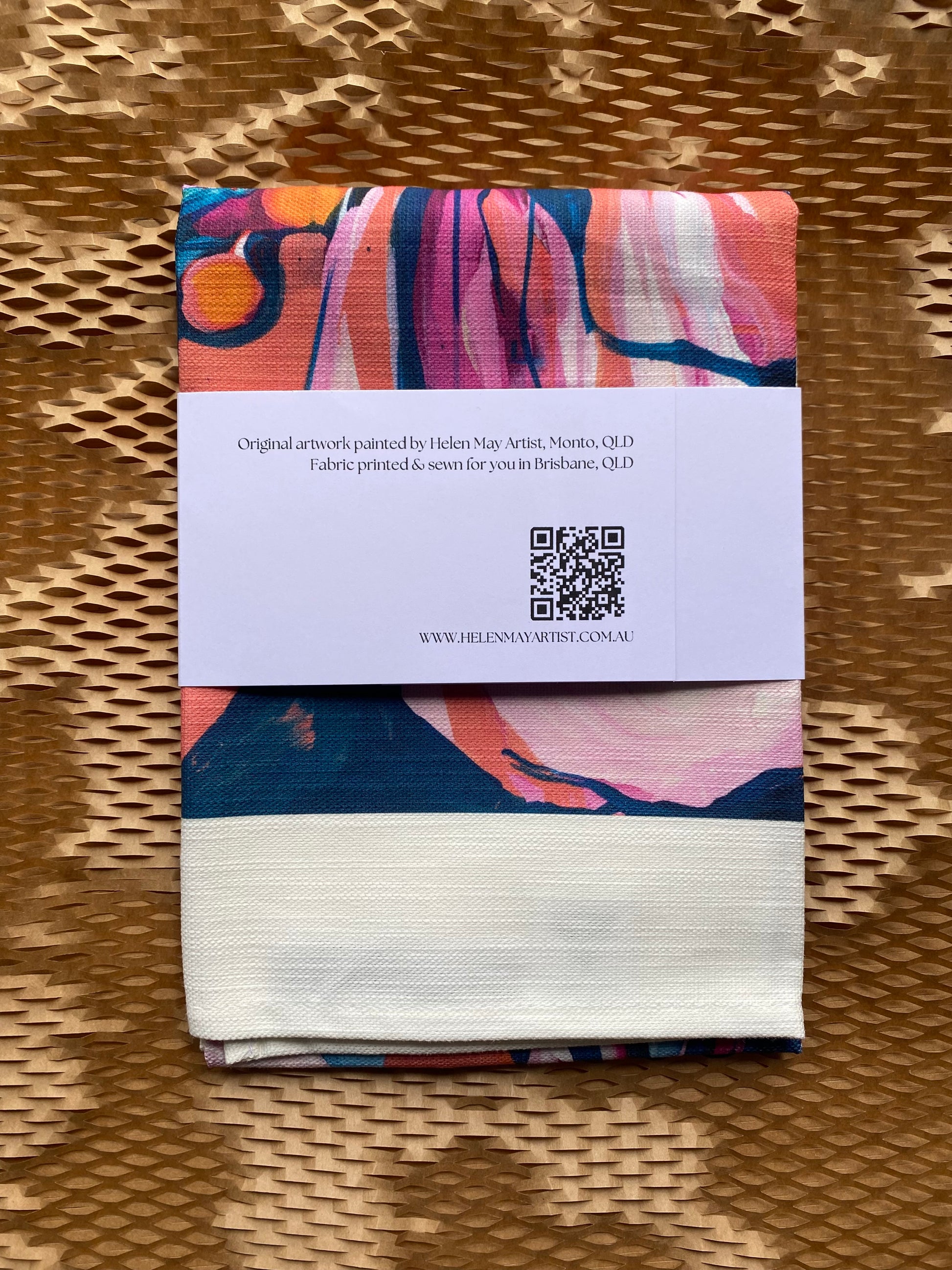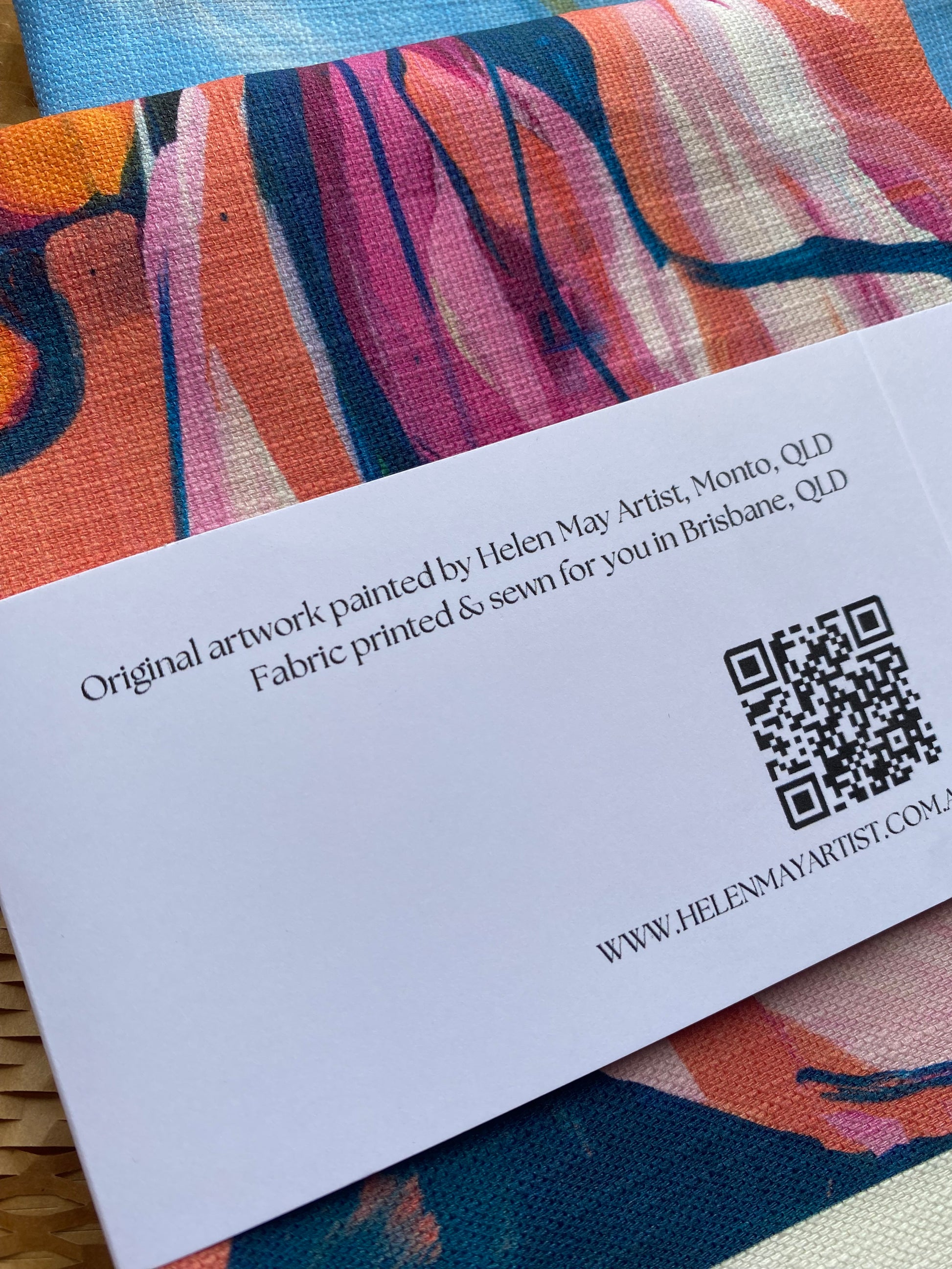 Each tea towel is carefully printed, cut and stitched in Brisbane, with the finished product being certified as 100% Australian made.