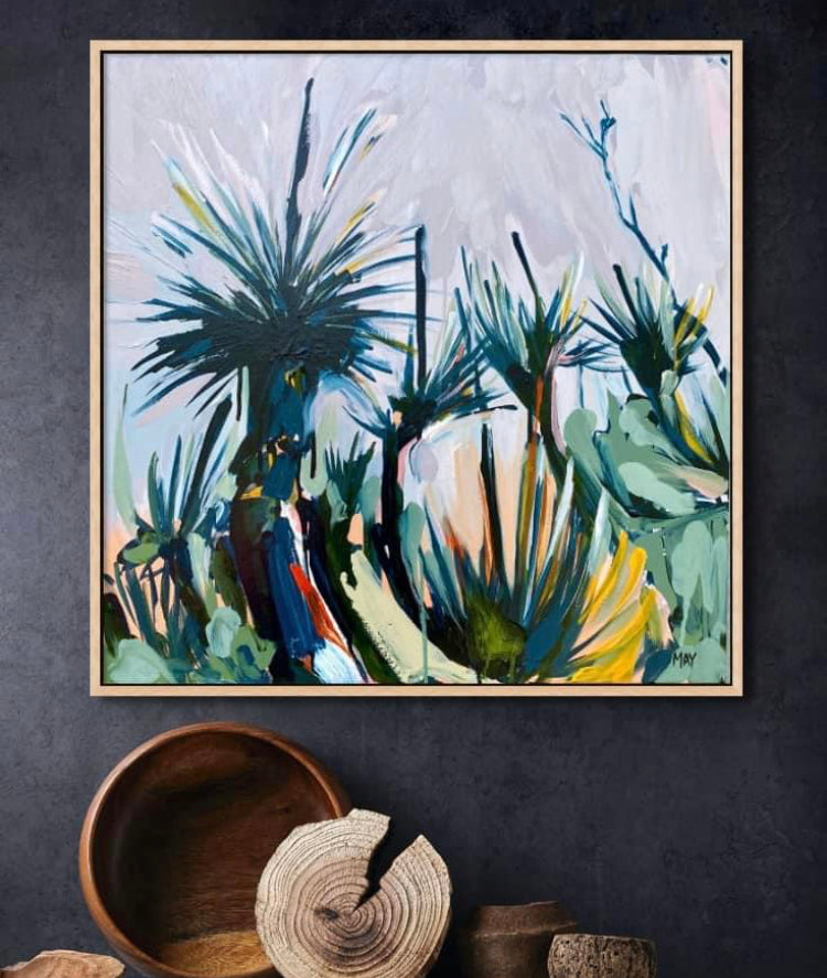 This original landscape painting showcases the unique Australian landscape with its iconic Grass Trees. The composition captures the intense beauty of the land under a purple hazy sky, evoking a sense of heat and natural resilience.