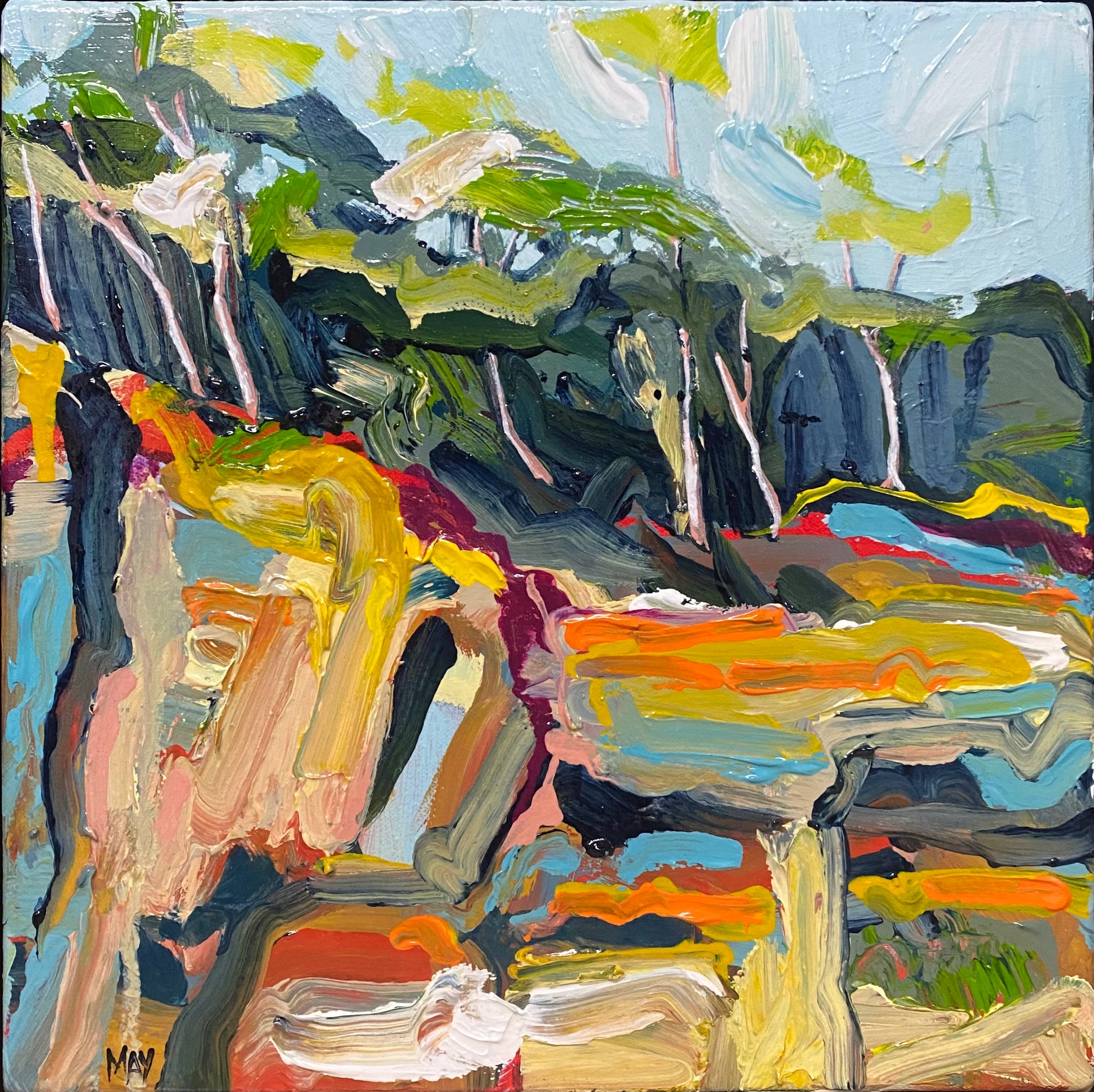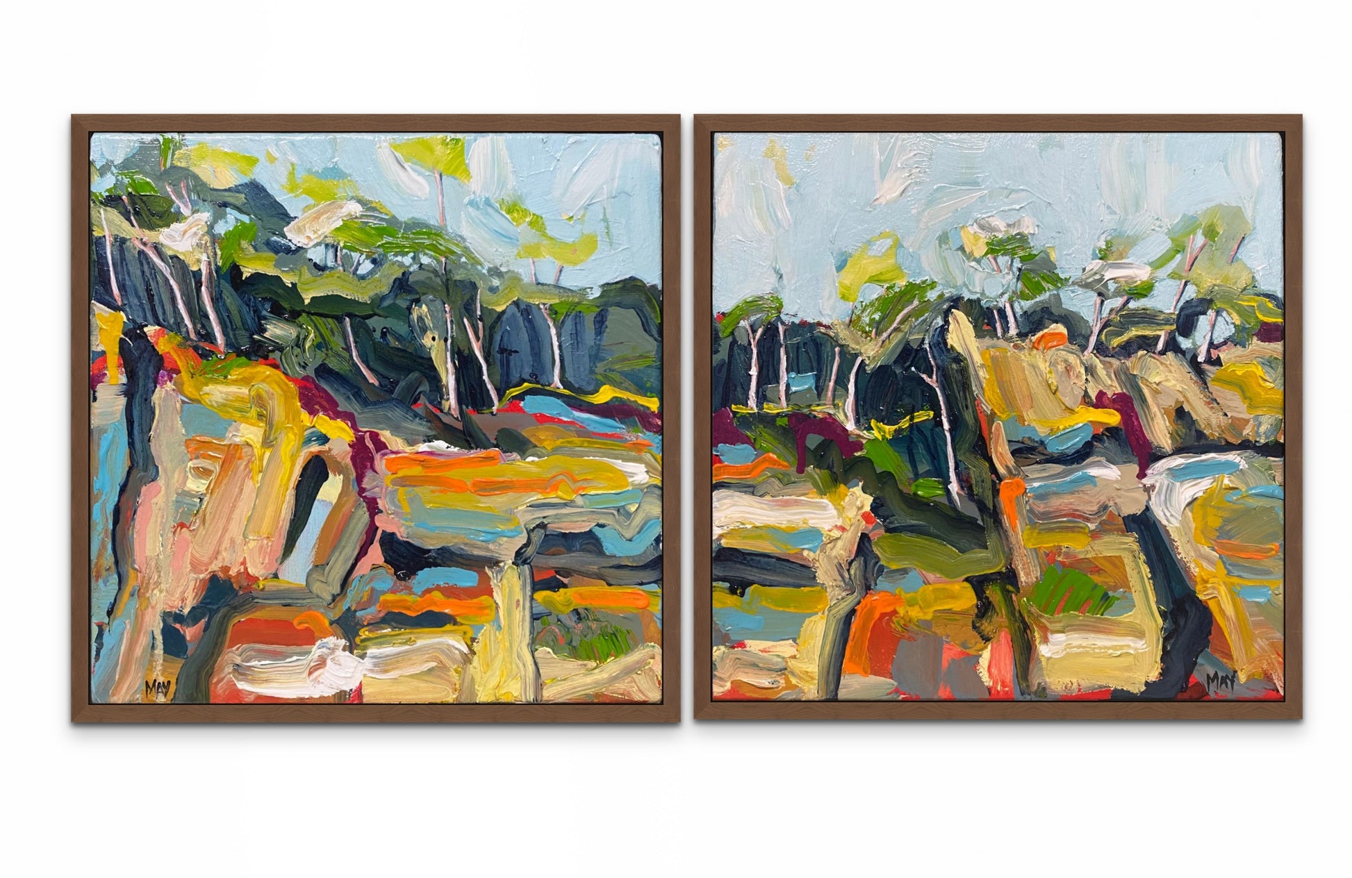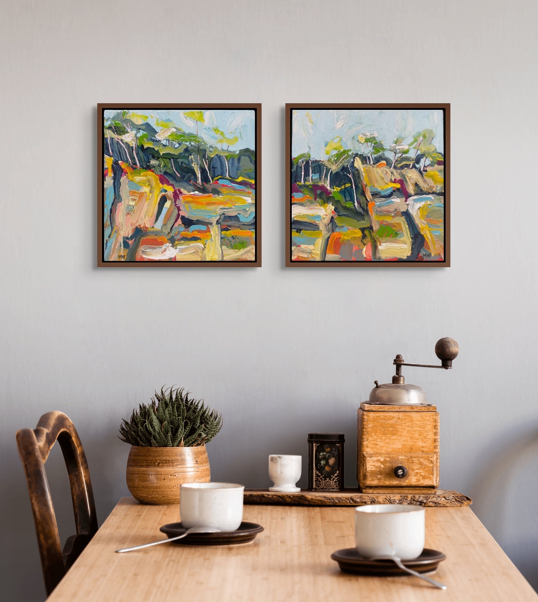 Inspired by the rugged beauty of Cania Gorge's sandstone cliffs, this small diptych delves into the interplay of vibrant colours and bold textures to depict not just a landscape, but a visual narrative.