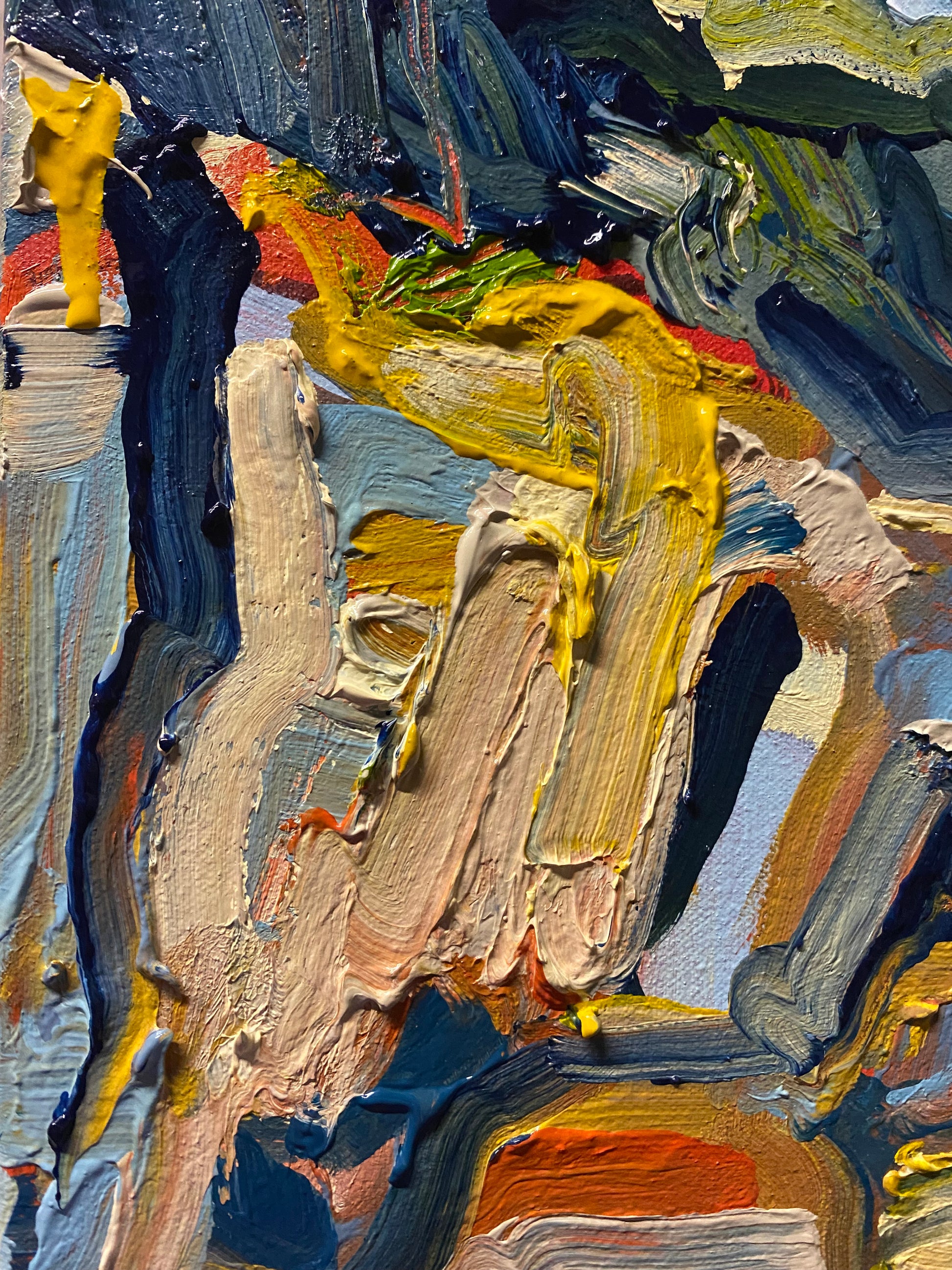 The dynamic brushstrokes and rich layers of paint reinterpret the geological scene with a heightened emphasis on texture, inviting viewers to explore the intricate details and undulating surfaces of the cliffs.